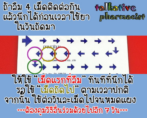 ตัวอย่างที่ 2: ลืมรับประทาน “เม็ดที่วงกลมสีแดง”, “เม็ดที่วงกลมสีเหลือง”, “เม็ดที่วงกลมสีชมพู” และ “เม็ดที่วงกลมสีเขียว” ในเวลา 21.00 น. ของวันอาทิตย์, วันจันทร์, วันอังคาร และวันพุธ ติดต่อกัน 4 วัน แล้วนึกได้ในเวลา 08.00 น. ของวันพฤหัสบดี