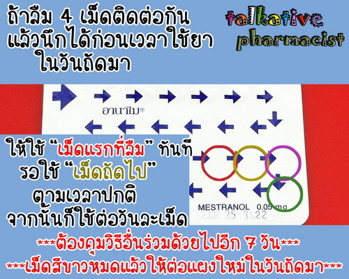 ให้แก้ไขโดยแกะ “เม็ดที่วงกลมสีเขียว” ซึ่งเป็น “เม็ดแรกที่ลืม” มารับประทานพร้อมกับ “เม็ดที่วงกลมสีส้ม” ซึ่งเป็น “เม็ดถัดไป” ในเวลา 21.00 น. ของวันเสาร์
