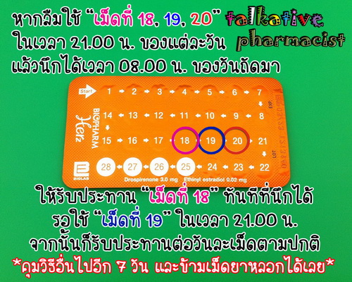 แล้วรับประทานต่อวันละเม็ด ในเวลา 21.00 น. ไปตามลำดับเรื่อย ๆ จนถึง “เม็ดที่ 24” ซึ่งเป็น “เม็ดยาฮอร์โมน” เม็ดสุดท้ายในแผง
