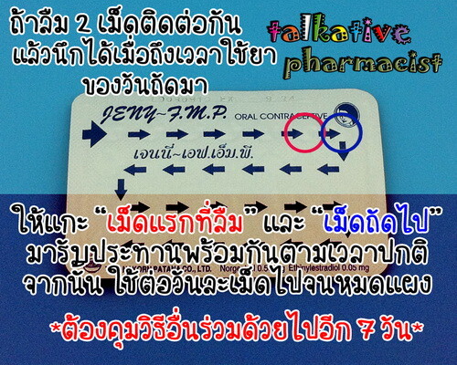 ให้แก้ไขโดยแกะ “เม็ดที่วงกลมสีแดง” ซึ่งเป็น “เม็ดแรกที่ลืม” มารับประทานพร้อมกับ “เม็ดที่วงกลมสีน้ำเงิน” ซึ่งเป็น “เม็ดถัดไป” ในเวลา 21.00 น. ของวันศุกร์