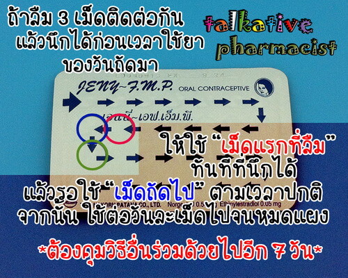 ให้แก้ไขโดยแกะ “เม็ดที่วงกลมสีแดง” ซึ่งเป็น “เม็ดแรกที่ลืม” มารับประทานพร้อมกับ “เม็ดที่วงกลมสีน้ำเงิน” ซึ่งเป็น “เม็ดถัดไป” ในเวลา 21.00 น. ของวันศุกร์