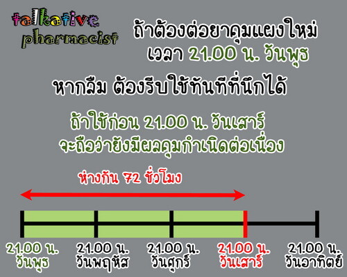 นับจากเวลาที่ควรต่อแผงใหม่ตามกำหนด (21.00 น. วันพุธ) ไปหาเวลาที่นึกได้ (21.00 น. วันพฤหัสบดี) จะห่างกัน 24 ชั่วโมง จึงถือว่าลืมต่อแผงใหม่น้อยกว่า 72 ชั่วโมงนะคะ