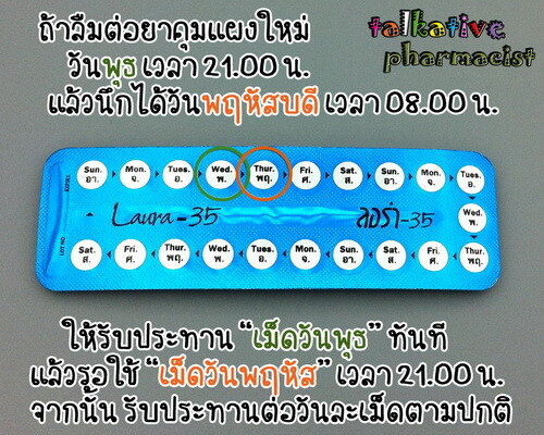 ดังนั้น ในกรณีที่ลืมต่อยาคุม “ลอร่า-35” แผงใหม่ในเวลา 21.00 น. ของวันพุธ หากนึกได้และแก้ไขทันก่อนที่จะถึงเวลา 21.00 น. ของวันเสาร์ ก็จะถือว่าลืมต่อแผงใหม่น้อยกว่า 72 ชั่วโมง และยังมีผลคุมกำเนิดต่อเนื่องนะคะ