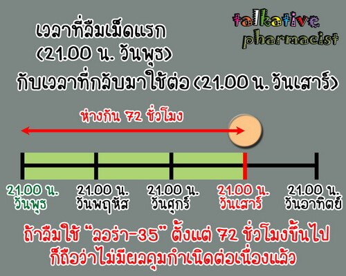 นับจากเวลาที่ลืมเม็ดแรก (21.00 น. วันพุธ) ไปหาเวลาที่นึกได้ (21.00 น. วันเสาร์) จะห่างกัน 72 ชั่วโมงพอดี