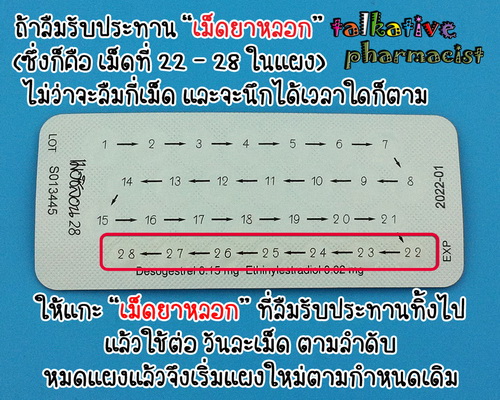 หากลืมรับประทาน “เม็ดยาหลอก” ก็ไม่มีปัญหาค่ะ ให้แกะเม็ดที่ลืมทิ้งไปเลย แล้วรอรับประทาน “เม็ดยาหลอก” ที่เหลืออยู่ไปตามปกติ ใช้หมดแผงแล้วจึงเริ่มแผงใหม่ในวันถัดมา