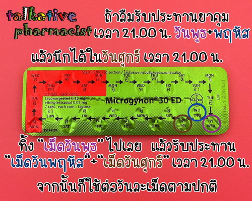 แต่ถ้าไม่สะดวกที่จะรับประทานในตอนนั้น หรือถ้านึกได้เมื่อถึงเวลารับประทานยาคุมประจำวันแล้ว ก็ให้แกะ “เม็ดวันพฤหัส” มารับประทานพร้อมกับ “เม็ดวันศุกร์” ในเวลา 21.00 น. ของวันศุกร์ได้เลย