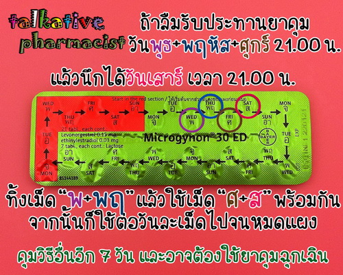 ดังนั้น เมื่อเวลาที่นึกได้ตรงกับเวลารับประทานยาคุมประจำวัน ก็ให้แกะ “เม็ดวันพฤหัส” และ “เม็ดวันศุกร์” ซึ่งเป็น “เม็ดยาฮอร์โมน” 2 เม็ดสุดท้ายในแผง มารับประทานในเวลา 21.00 น. ของวันเสาร์